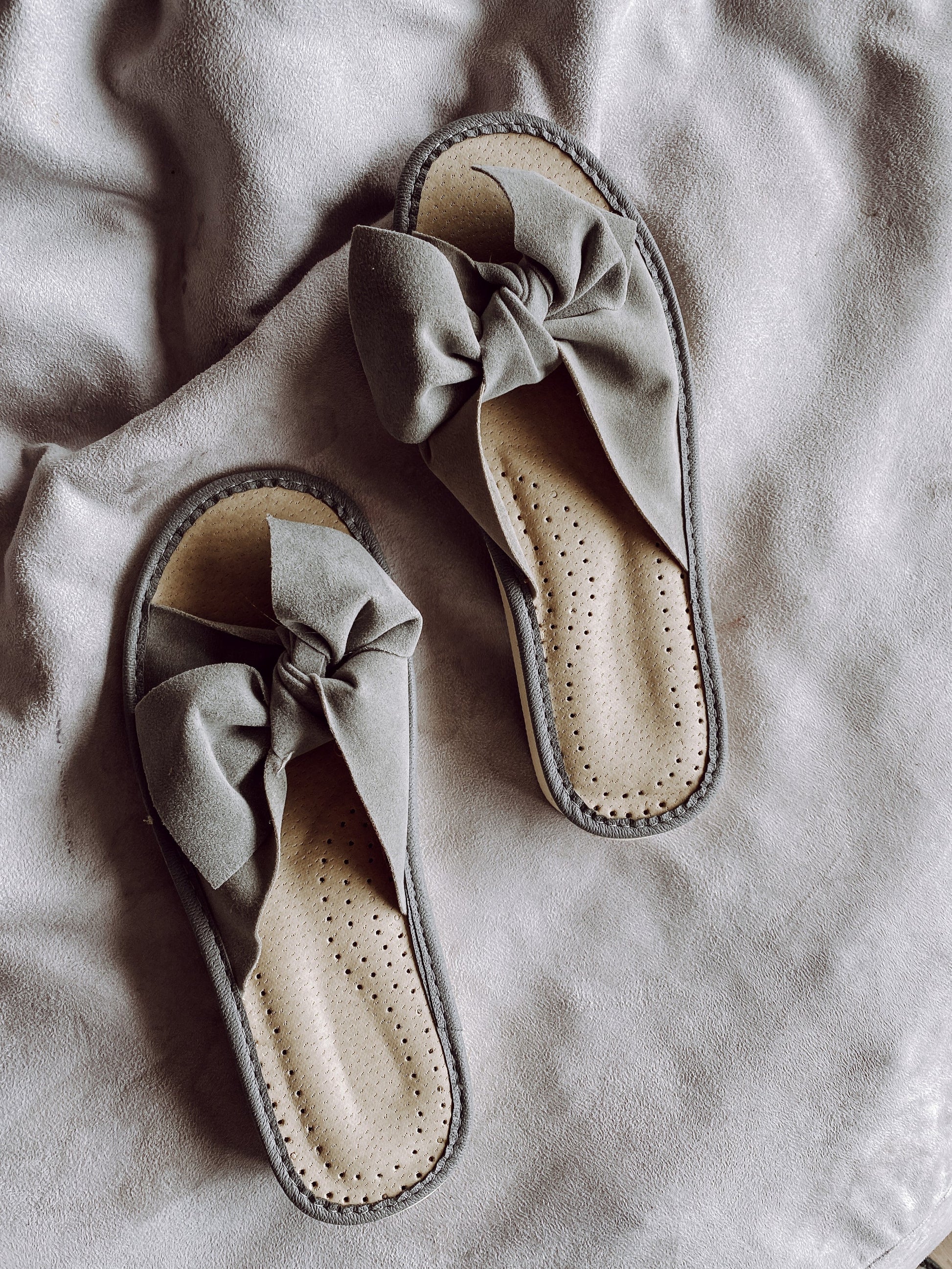 Lovely suede slippers with a ribbon front and cushioned soft insole.