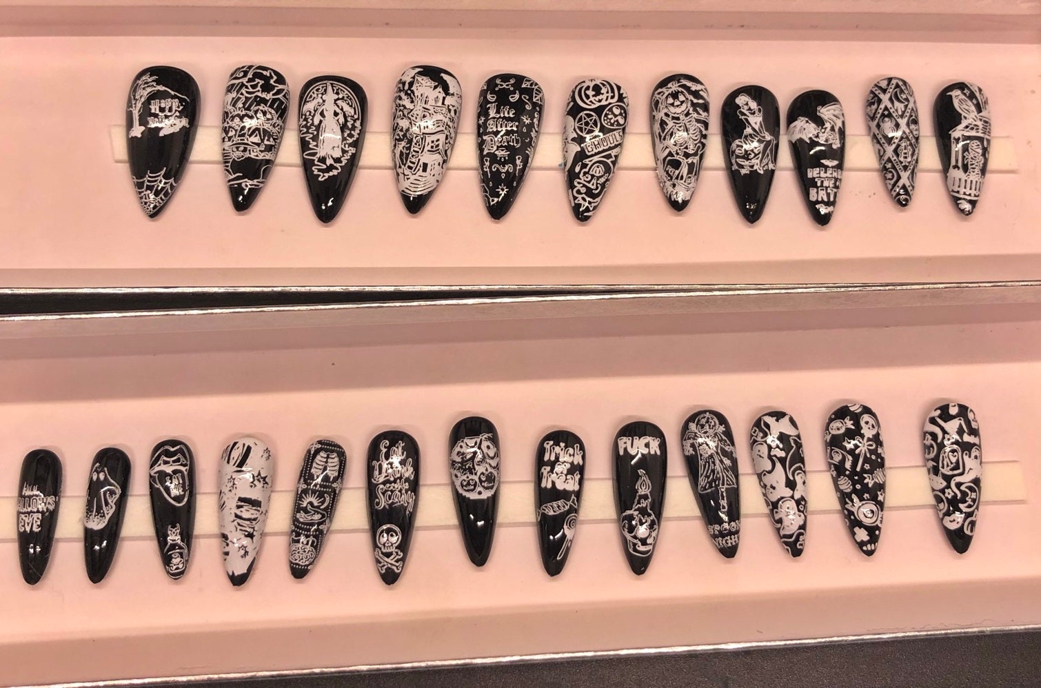 set of 24 Halloween themed press on stiletto, coffin, or short nails